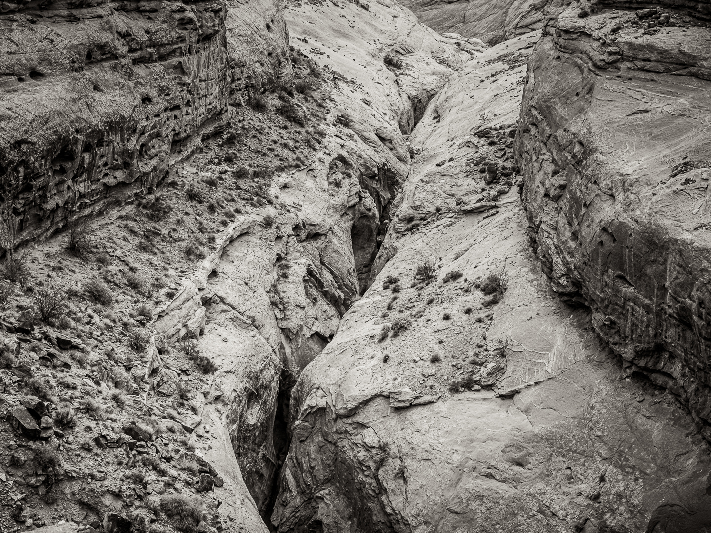 The above color version is a pretty accurate rendition of the color of the rocks in this area. The color is fascinating, but in this image detracts from the danger of that dangerous crevice.