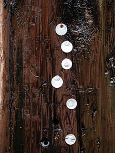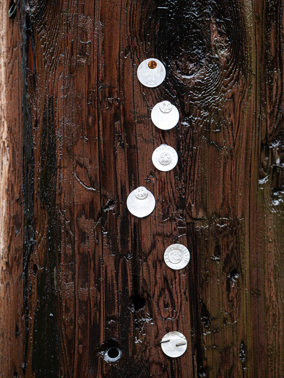 At first, I couldn't decipher if these were coins or markers. I think they are meaningful to the utility crews who do the maintenance.