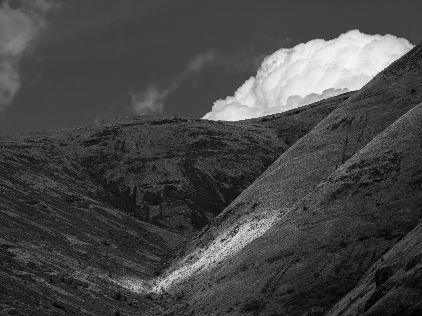 Converting to grayscale gave me an opportunity to push tones to a more pleasing contrast. That emphasized the shaft of sunlight, but also brought out the cloud. I wasn't expecting to be able to pull out this much detail in the cloud, but it sure does work in the finished version at left.