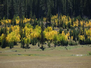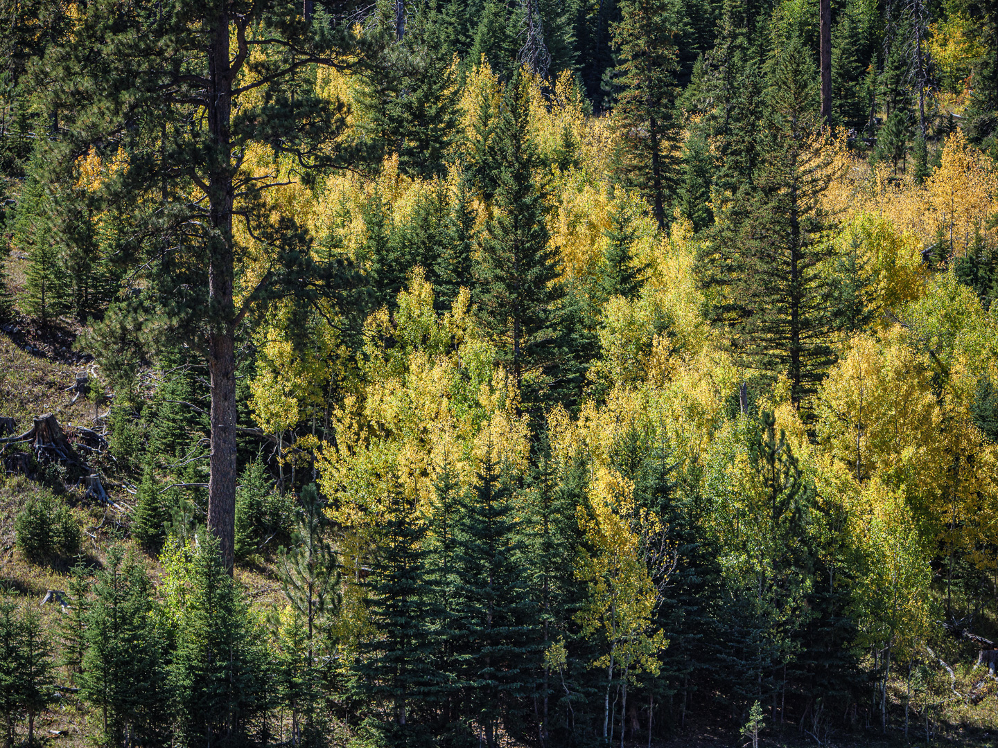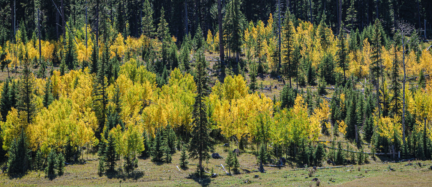 That burst of yellow leaves against the green of the evergreen trees.