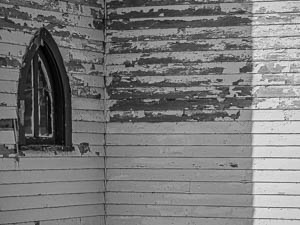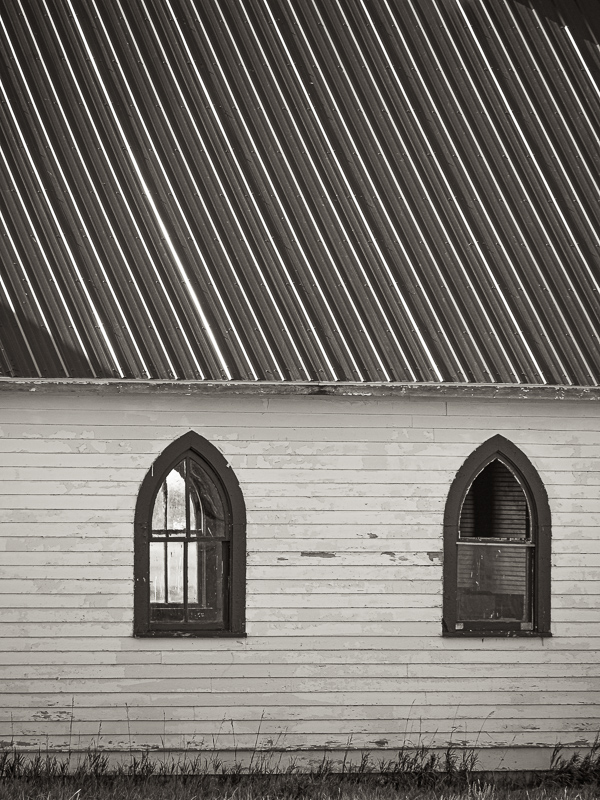 The image above was the first one that I saw from the highway. Click! But as I drove around to the back, the two windows and the double cross in the left one caught my eye. The modern tin roof was a disappointment when I first saw it, but then I realized the parallel lines created a pattern that was pretty complementary to the horizontal boards on the side of the wall. Here again, I have a horizontal option above and a strong vertical composition at left. |