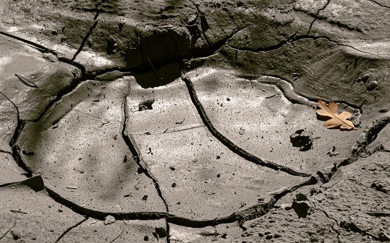 The mud had some color in it which I wanted to eliminate. I made a selection of all the mud, desaturated it, and then toned it brown. The leaf is its natural color. |