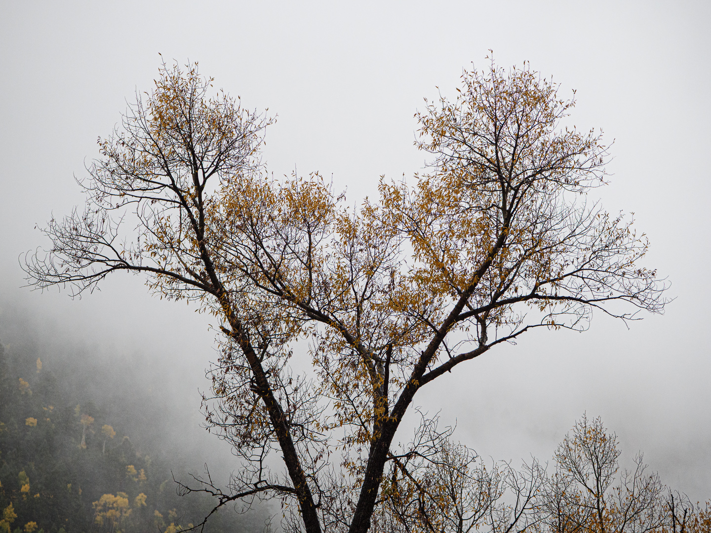 The way the main tree stands out against the fog is what makes this image a success. To express the fall colors, we don't always need to overwhelm the viewer's eye with color. |
