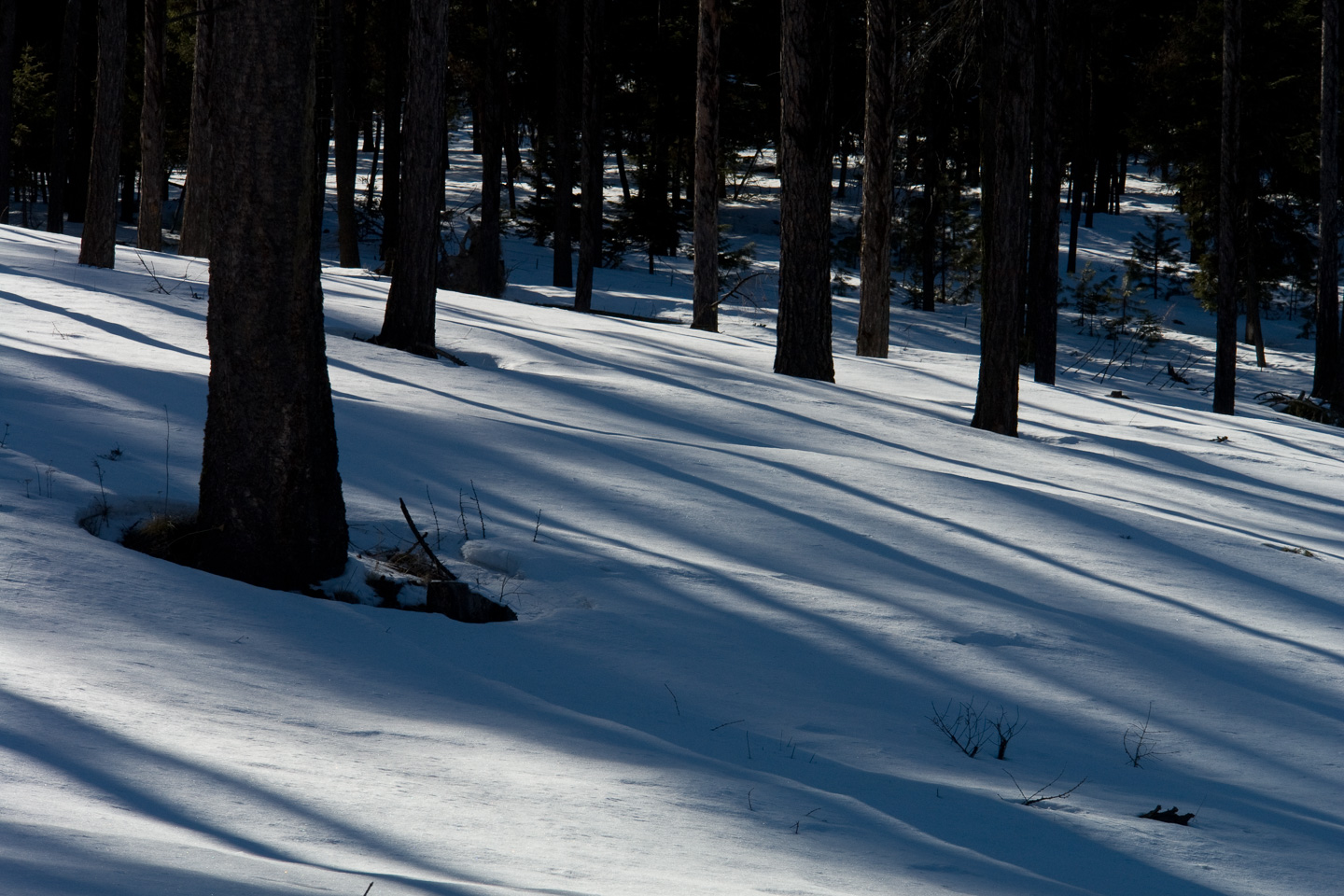 Yet another snow scene. Just love them, especially when there is some sunlight to make the snow glisten. I like the diagonals of the shadows that contrast with the vertical tree trunks.