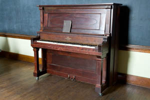 Each piano has a personality. The one at left with all that fancy woodwork that parallels the manufacturer's label make this one much more of interest. The two candles are a nice touch, too. Where's Liberace when you need him?