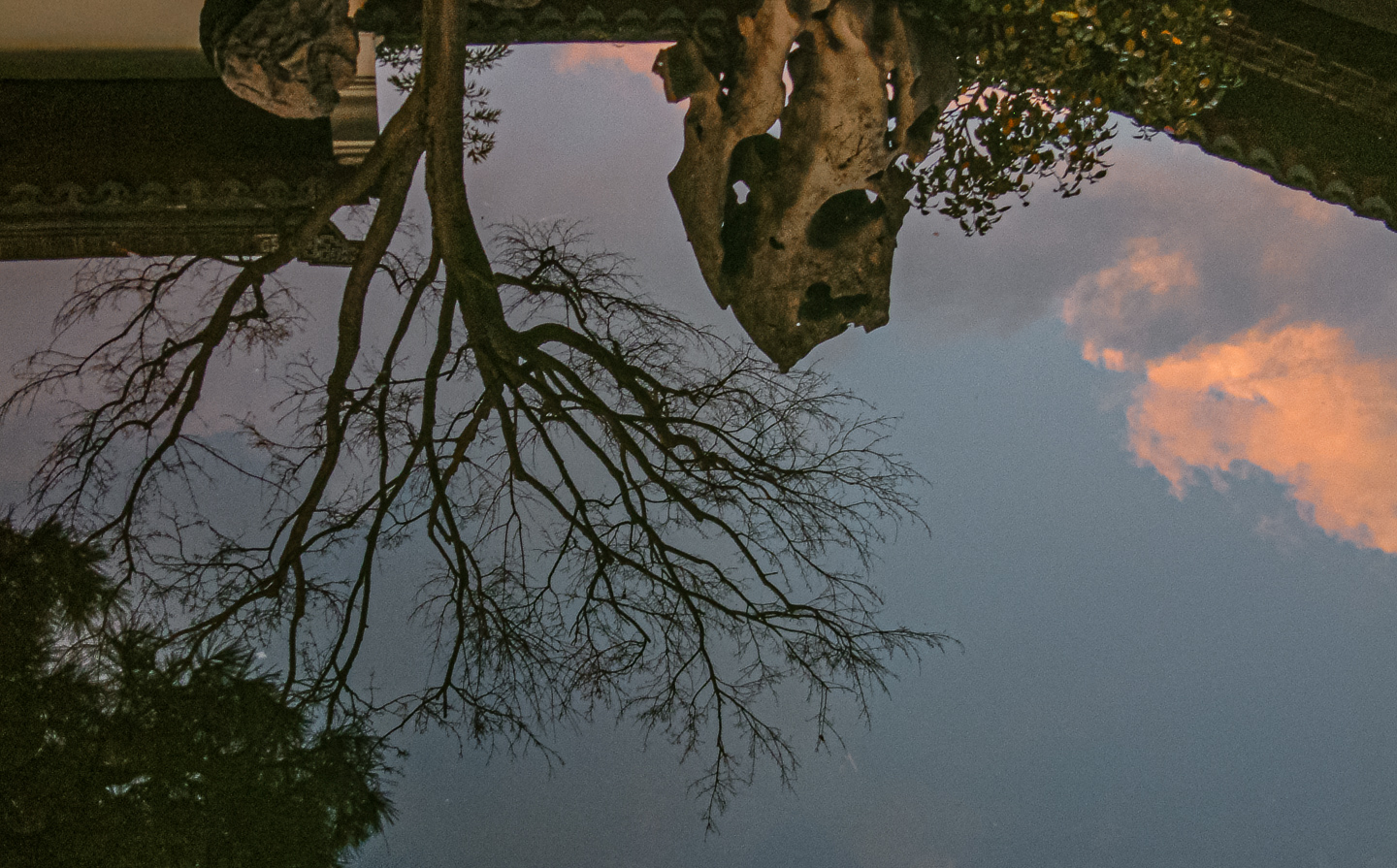 At some point, I started paying attention to the reflections in the water feature of the garden. That became the point of view I chose to explore with the image at left. |