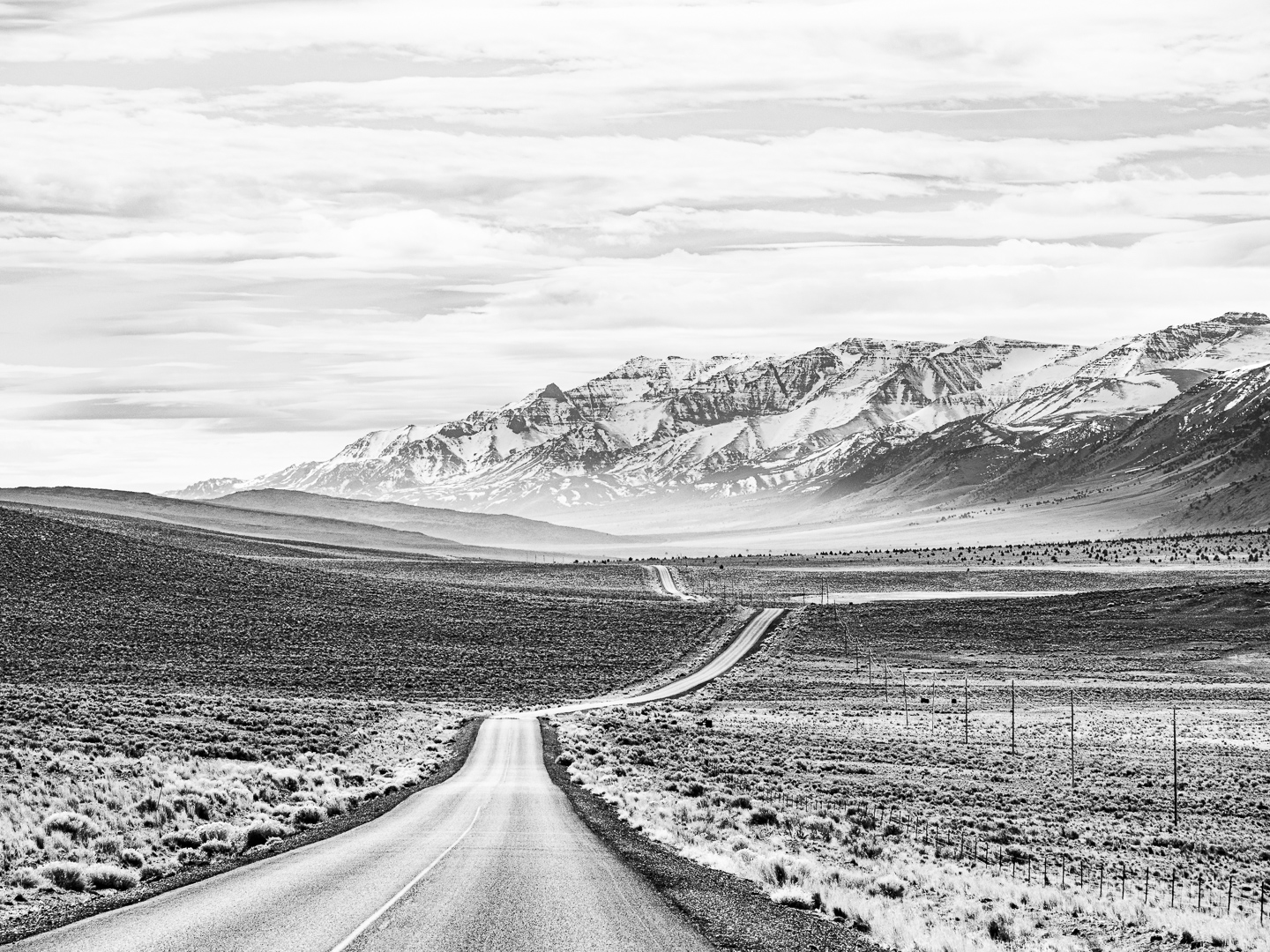 The image at left was made just a few hundred yards from where I photographed the above. The road seems to amplify the distance and height of the mountains in the background. Context makes this image. The foreground is desert grass and sage brush as far as we can see — until the snow-covered mountains rise out of the desert in the distance. This is one of my all-time favorite landscapes for this reason. |